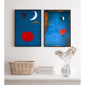 Kit 2 quadros miró azul e vermelho 45x34cm - com vidro Moldura: madeira preta Informações do produto tire todas as suas dúvidas no descritivo abaixo: decoração para quarto, sala, cozinha, escritório, área gourmet e muito mais. Chega de paredes vazias medidas - cada peça tem 45x34cm a3 . Material do papel - papel fotográfico brilhante de altíssima resolução acabamento - todos os quadros são acompanhados de vidro para proteção da imagem. - moldura em madeira maciça na cor preta ou branca conforme produto escolhido e pendurador . - os quadros são embalados de forma segura com plástico bolha com camada dupla de acordo com o tamanho dos quadros. Garantia - garantia de 3 meses. Meu quadro chegou. Como posso fixá-lo Você precisa apenas de um martelo e um prego, pois os quadros já vão acompanhados de penduradores. Esta é a forma mais indicada. Como posso limpar meu quadro A limpeza é feita como um móvel comum da sua casa. Apenas um pano seco ou espanador são suficientes para tal Ean: 7895667732172