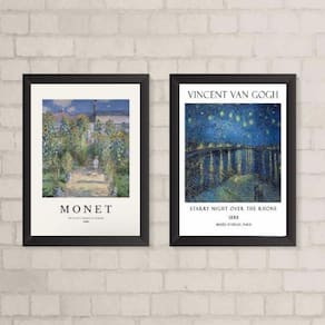 Principais características: - Kit com 2 quadros de paisagens de Monet e Van Gogh - Medidas de 24x18cm A5 - Moldura em madeira maciça na cor preta - Acompanhados de vidro para proteção da imagem - Fácil de fixar na parede com penduradores - Limpeza simples com pano seco ou espanador - Garantia de 3 meses