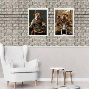 Kit 2 quadros motociclistas - cães 24x18cm Moldura: madeira preta Informações do produto tire todas as suas dúvidas no descritivo abaixo: decoração para quarto, sala, cozinha, escritório, área gourmet e muito mais. Chega de paredes vazias medidas - cada peça tem 24x18cm a5 . Material do papel - papel fotográfico brilhante de altíssima resolução acabamento - todos os quadros são acompanhados de uma película de acetato para proteção da imagem. - os quadros são embalados de forma segura com plástico bolha com camada dupla de acordo com o tamanho dos quadros. Garantia - garantia de 3 meses. Meu quadro chegou. Como posso fixá-lo Você precisa apenas de um martelo e um prego, pois os quadros já vão acompanhados de penduradores. Esta é a forma mais indicada. Caso prefira, você pode utilizar uma fita dupla face neste caso, sugerimos de alta qualidade para evitar que descole e seu quadro caia . Como posso limpar meu quadro A limpeza é feita como um móvel comum da sua casa. Apenas um pano seco ou espanador são suficientes para tal