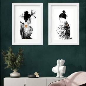 Kit 2 quadros mulher árvore lua - 60x48cm Moldura: madeira branca Informações do produto tire todas as suas dúvidas no descritivo abaixo: decoração para quarto, sala, cozinha, escritório, área gourmet e muito mais. Chega de paredes vazias medidas - cada peça tem 60x48cm . Material do papel - papel fotográfico brilhante de altíssima resolução acabamento - todos os quadros são acompanhados de vidro para proteção da imagem. - moldura em madeira maciça na cor preta ou branca conforme produto escolhido e pendurador. - paspatur branco com 7cm de largura - os quadros são embalados de forma segura com plástico bolha com camada dupla de acordo com o tamanho dos quadros. Garantia - garantia de 3 meses. Meu quadro chegou. Como posso fixá-lo Você precisa apenas de um martelo e um prego, pois os quadros já vão acompanhados de penduradores. Esta é a forma mais indicada. Como posso limpar meu quadro A limpeza é feita como um móvel comum da sua casa. Apenas um pano seco ou espanador são suficientes para tal Ean: 7894317768660
