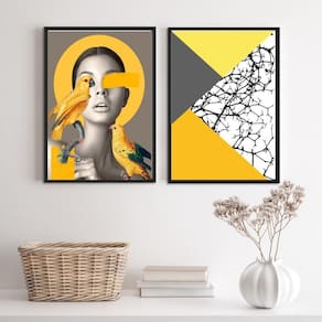Especificações técnicas: - Título: Kit 2 Quadros Cinza e Amarelo Mulher Pássaros Abstrato - Medidas: 45x34cm cada peça - Material do papel: Papel fotográfico brilhante de altíssima resolução - Acabamento: Moldura em madeira preta e vidro para proteção da imagem - Fixação: Acompanha penduradores para fácil instalação - Embalagem: Os quadros são embalados com plástico bolha de acordo com o tamanho