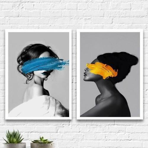 Kit 2 Quadros Mulheres Com Tinta Azul Amarelo 33X24Cm Branca
