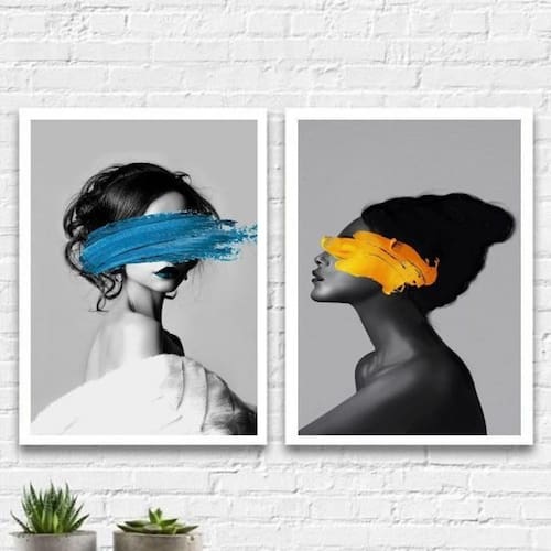 Kit 2 Quadros Mulheres Com Tinta Azul Amarelo 45X34Cm Branca
