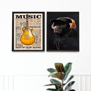 Kit 2 quadros music life - chimpanzé 33x24cm - com vidro Moldura: madeira branca Informações do produto tire todas as suas dúvidas no descritivo abaixo: decoração para quarto, sala, cozinha, escritório, área gourmet e muito mais. Chega de paredes vazias medidas - cada peça tem 33x24cm a4 . Material do papel - papel fotográfico brilhante de altíssima resolução acabamento - todos os quadros são acompanhados de vidro para proteção da imagem. - moldura em madeira maciça na cor preta ou branca conforme produto escolhido e pendurador . - os quadros são embalados de forma segura com plástico bolha com camada dupla de acordo com o tamanho dos quadros. Garantia - garantia de 3 meses. Meu quadro chegou. Como posso fixá-lo Você precisa apenas de um martelo e um prego, pois os quadros já vão acompanhados de penduradores. Esta é a forma mais indicada. Como posso limpar meu quadro A limpeza é feita como um móvel comum da sua casa. Apenas um pano seco ou espanador são suficientes para tal