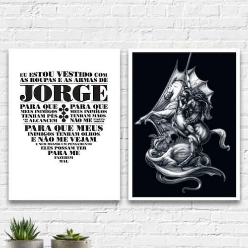 Kit 2 quadros oração de são jorge 45x34cm Moldura: madeira branca Informações do produto tire todas as suas dúvidas no descritivo abaixo: decoração para quarto, sala, cozinha, escritório, área gourmet e muito mais. Chega de paredes vazias medidas - cada peça tem 45x34cm a3 . Material do papel - papel fotográfico brilhante de altíssima resolução acabamento - todos os quadros são acompanhados de uma película de acetato para proteção da imagem. - moldura em madeira maciça na cor preta e pendurador móvel que pode ser retirado facilmente caso deseje fixar com fita dupla face. - os quadros são embalados de forma segura com plástico bolha com camada dupla de acordo com o tamanho dos quadros. - de 3 meses. Meu quadro chegou. Como posso fixá-lo Você precisa apenas de um martelo e um prego, pois os quadros já vão acompanhados de penduradores. Esta é a forma mais indicada. Caso prefira, você pode utilizar uma fita dupla face neste caso, sugerimos de alta qualidade para evitar que descole e seu quadro caia . Como posso limpar meu quadro A limpeza é feita como um móvel comum da sua casa. Apenas um pano seco ou espanador são suficientes para tal