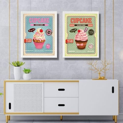 Kit 2 quadros para cozinha - cupcakes 45x34cm - com vidro Cor: moldura branca Informações do produto tire todas as suas dúvidas no descritivo abaixo: decoração para quarto, sala, cozinha, escritório, área gourmet e muito mais. Chega de paredes vazias medidas - cada peça tem 45x34cm a3 . Material do papel - papel fotográfico brilhante de altíssima resolução acabamento - todos os quadros são acompanhados de vidro para proteção da imagem. - moldura em madeira maciça na cor preta ou branca conforme produto escolhido e pendurador . - os quadros são embalados de forma segura com plástico bolha com camada dupla de acordo com o tamanho dos quadros. Garantia - garantia de 3 meses. Meu quadro chegou. Como posso fixá-lo Você precisa apenas de um martelo e um prego, pois os quadros já vão acompanhados de penduradores. Esta é a forma mais indicada. Como posso limpar meu quadro A limpeza é feita como um móvel comum da sua casa. Apenas um pano seco ou espanador são suficientes para tal