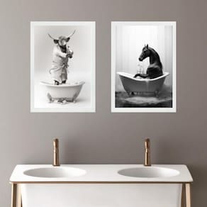 Kit 2 quadros para decorar banheiro - boi e cavalo 24x18cm Moldura: madeira branca Informações do produto tire todas as suas dúvidas no descritivo abaixo: decoração para quarto, sala, cozinha, escritório, área gourmet e muito mais. Chega de paredes vazias medidas - cada peça tem 24x18cm a5 . Material do papel - papel fotográfico brilhante de altíssima resolução acabamento - todos os quadros são acompanhados de uma película de acetato para proteção da imagem. - os quadros são embalados de forma segura com plástico bolha com camada dupla de acordo com o tamanho dos quadros. - de 3 meses. Meu quadro chegou. Como posso fixá-lo Você precisa apenas de um martelo e um prego, pois os quadros já vão acompanhados de penduradores. Esta é a forma mais indicada. Caso prefira, você pode utilizar uma fita dupla face neste caso, sugerimos de alta qualidade para evitar que descole e seu quadro caia . Como posso limpar meu quadro A limpeza é feita como um móvel comum da sua casa. Apenas um pano seco ou espanador são suficientes para tal Marca: Não Informado Ean: 7891980345952