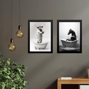 Kit 2 quadros para decorar banheiro - boi e cavalo 33x24cm Moldura: madeira branca Informações do produto tire todas as suas dúvidas no descritivo abaixo: decoração para quarto, sala, cozinha, escritório, área gourmet e muito mais. Chega de paredes vazias medidas - cada peça tem 33x24cm a4 . Material do papel - papel fotográfico brilhante de altíssima resolução acabamento - todos os quadros são acompanhados de uma película de acetato para proteção da imagem. - os quadros são embalados de forma segura com plástico bolha com camada dupla de acordo com o tamanho dos quadros. - de 3 meses. Meu quadro chegou. Como posso fixá-lo Você precisa apenas de um martelo e um prego, pois os quadros já vão acompanhados de penduradores. Esta é a forma mais indicada. Caso prefira, você pode utilizar uma fita dupla face neste caso, sugerimos de alta qualidade para evitar que descole e seu quadro caia . Como posso limpar meu quadro A limpeza é feita como um móvel comum da sua casa. Apenas um pano seco ou espanador são suficientes para tal Marca: Não Informado