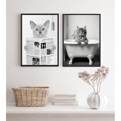 Kit 2 quadros para decorar banheiro- gatos 45x34cm Moldura: madeira preta Informações do produto tire todas as suas dúvidas no descritivo abaixo: decoração para quarto, sala, cozinha, escritório, área gourmet e muito mais. Chega de paredes vazias. Medidas - cada peça tem 45x34cm a3 . Material do papel - papel fotográfico brilhante de altíssima resolução acabamento - todos os quadros são acompanhados de uma película de acetato para proteção da imagem. - os quadros são embalados de forma segura com plástico bolha com camada dupla de acordo com o tamanho dos quadros. Garantia - garantia de 3 meses. Meu quadro chegou. Como posso fixá-lo Você precisa apenas de um martelo e um prego, pois os quadros já vão acompanhados de penduradores. Esta é a forma mais indicada. Caso prefira, você pode utilizar uma fita dupla face neste caso, sugerimos de alta qualidade para evitar que descole e seu quadro caia . Como posso limpar meu quadro A limpeza é feita como um móvel comum da sua casa. Apenas um pano seco ou espanador são suficientes para tal