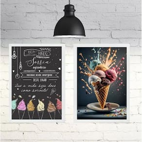 Kit 2 quadros para decorar sorveteria 45x34cm - com vidro Cor: moldura branca Informações do produto tire todas as suas dúvidas no descritivo abaixo: decoração para quarto, sala, cozinha, escritório, área gourmet e muito mais. Chega de paredes vazias medidas - cada peça tem 45x34cm a3 . Material do papel - papel fotográfico brilhante de altíssima resolução acabamento - todos os quadros são acompanhados de vidro para proteção da imagem. - moldura em madeira maciça na cor preta ou branca conforme produto escolhido e pendurador . - os quadros são embalados de forma segura com plástico bolha com camada dupla de acordo com o tamanho dos quadros. Garantia - garantia de 3 meses. Meu quadro chegou. Como posso fixá-lo Você precisa apenas de um martelo e um prego, pois os quadros já vão acompanhados de penduradores. Esta é a forma mais indicada. Como posso limpar meu quadro A limpeza é feita como um móvel comum da sua casa. Apenas um pano seco ou espanador são suficientes para tal Ean: 7891234502124