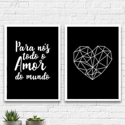 Kit 2 quadros para nós todo o amor do mundo 24x18cm Moldura: madeira branca Informações do produto tire todas as suas dúvidas no descritivo abaixo: decoração para quarto, sala, cozinha, escritório, área gourmet e muito mais. Chega de paredes vazias medidas - cada peça tem 24x18cm a5 . Material do papel - papel fotográfico brilhante de altíssima resolução acabamento - todos os quadros são acompanhados de uma película de acetato para proteção da imagem. - moldura em madeira maciça na cor preta e pendurador móvel que pode ser retirado facilmente caso deseje fixar com fita dupla face. - os quadros são embalados de forma segura com plástico bolha com camada dupla de acordo com o tamanho dos quadros. Garantia - garantia de 3 meses. Meu quadro chegou. Como posso fixá-lo Você precisa apenas de um martelo e um prego, pois os quadros já vão acompanhados de penduradores. Esta é a forma mais indicada. Caso prefira, você pode utilizar uma fita dupla face neste caso, sugerimos de alta qualidade para evitar que descole e seu quadro caia . Como posso limpar meu quadro A limpeza é feita como um móvel comum da sua casa. Apenas um pano seco ou espanador são suficientes para tal