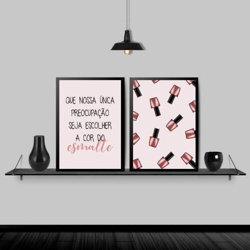 Kit 2 quadros para salão frase esmalte 33x24cm Moldura: madeira preta Informações do produto tire todas as suas dúvidas no descritivo abaixo: decoração para quarto, sala, cozinha, escritório, área gourmet e muito mais. Chega de paredes vazias medidas - cada peça tem 33x24cm a4 . Material do papel - papel fotográfico brilhante de altíssima resolução acabamento - todos os quadros são acompanhados de uma película de acetato para proteção da imagem. - os quadros são embalados de forma segura com plástico bolha com camada dupla de acordo com o tamanho dos quadros. - de 3 meses. Meu quadro chegou. Como posso fixá-lo Você precisa apenas de um martelo e um prego, pois os quadros já vão acompanhados de penduradores. Esta é a forma mais indicada. Caso prefira, você pode utilizar uma fita dupla face neste caso, sugerimos de alta qualidade para evitar que descole e seu quadro caia . Como posso limpar meu quadro A limpeza é feita como um móvel comum da sua casa. Apenas um pano seco ou espanador são suficientes para tal Marca: Não Informado