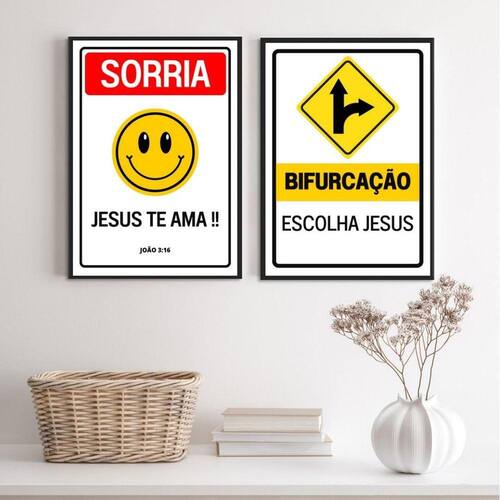 Kit 2 quadros placas cristãs - jesus 33x24cm - com vidro Moldura: madeira branca Informações do produto tire todas as suas dúvidas no descritivo abaixo: decoração para quarto, sala, cozinha, escritório, área gourmet e muito mais. Chega de paredes vazias medidas - cada peça tem 33x24cm a4 . Material do papel - papel fotográfico brilhante de altíssima resolução acabamento - todos os quadros são acompanhados de vidro para proteção da imagem. - moldura em madeira maciça na cor preta ou branca conforme produto escolhido e pendurador . - os quadros são embalados de forma segura com plástico bolha com camada dupla de acordo com o tamanho dos quadros. Garantia - garantia de 3 meses. Meu quadro chegou. Como posso fixá-lo Você precisa apenas de um martelo e um prego, pois os quadros já vão acompanhados de penduradores. Esta é a forma mais indicada. Como posso limpar meu quadro A limpeza é feita como um móvel comum da sua casa. Apenas um pano seco ou espanador são suficientes para tal