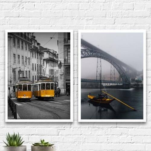 Kit 2 Quadros Portugal Amarelos 33X24Cm Madeira Branca