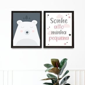 Kit 2 quadros quarto bebê urso rosa e cinza 33x24cm - com vidro Moldura: madeira preta Informações do produto tire todas as suas dúvidas no descritivo abaixo: decoração para quarto, sala, cozinha, escritório, área gourmet e muito mais. Chega de paredes vazias medidas - cada peça tem 33x24cm a4 . Material do papel - papel fotográfico brilhante de altíssima resolução acabamento - todos os quadros são acompanhados de vidro para proteção da imagem. - moldura em madeira maciça na cor preta ou branca conforme produto escolhido e pendurador . - os quadros são embalados de forma segura com plástico bolha com camada dupla de acordo com o tamanho dos quadros. Garantia - garantia de 3 meses. Meu quadro chegou. Como posso fixá-lo Você precisa apenas de um martelo e um prego, pois os quadros já vão acompanhados de penduradores. Esta é a forma mais indicada. Como posso limpar meu quadro A limpeza é feita como um móvel comum da sua casa. Apenas um pano seco ou espanador são suficientes para tal