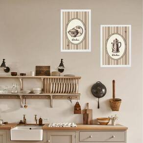Kit 2 quadros retrô cozinha de vó 24x18cm - com vidro Moldura: madeira preta Informações do produto tire todas as suas dúvidas no descritivo abaixo: decoração para quarto, sala, cozinha, escritório, área gourmet e muito mais. Chega de paredes vazias medidas - cada peça tem 24x18cm a5 . Material do papel - papel fotográfico brilhante de altíssima resolução acabamento - todos os quadros são acompanhados de vidro para proteção da imagem. - moldura em madeira maciça na cor preta ou branca conforme produto escolhido e pendurador . - os quadros são embalados de forma segura com plástico bolha com camada dupla de acordo com o tamanho dos quadros. Garantia - garantia de 3 meses. Meu quadro chegou. Como posso fixá-lo Você precisa apenas de um martelo e um prego, pois os quadros já vão acompanhados de penduradores. Esta é a forma mais indicada. Como posso limpar meu quadro A limpeza é feita como um móvel comum da sua casa. Apenas um pano seco ou espanador são suficientes para tal