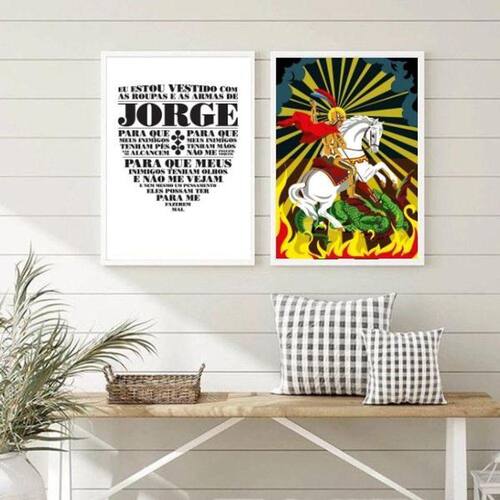 O Kit 2 Quadros São Jorge Guerreiro Oração 45X34Cm - Com Vidro é perfeito para decorar diversos ambientes, como quarto, sala, cozinha, escritório, área gourmet e muito mais. Com medidas de 45x34cm A3 , cada peça é feita com material de alta qualidade e conta com uma bela moldura de madeira branca.
