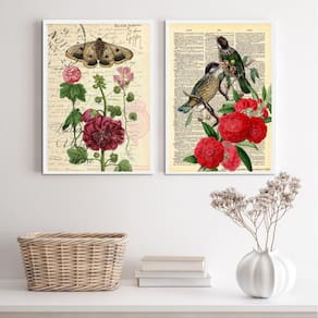 Kit 2 quadros para varanda pássaro borboletas e flores 45x34cm