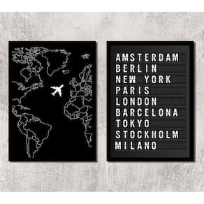 Kit 2 quadros viagem placa de aeroporto 24x18cm - com vidro Moldura: madeira preta Informações do produto tire todas as suas dúvidas no descritivo abaixo: decoração para quarto, sala, cozinha, escritório, área gourmet e muito mais. Chega de paredes vazias medidas - cada peça tem 24x18cm a5 . Material do papel - papel fotográfico brilhante de altíssima resolução acabamento - todos os quadros são acompanhados de vidro para proteção da imagem. - moldura em madeira maciça na cor preta e pendurador . - os quadros são embalados de forma segura com plástico bolha com camada dupla de acordo com o tamanho dos quadros. Garantia - garantia de 3 meses. Meu quadro chegou. Como posso fixá-lo Você precisa apenas de um martelo e um prego, pois os quadros já vão acompanhados de penduradores. Esta é a forma mais indicada. Como posso limpar meu quadro A limpeza é feita como um móvel comum da sua casa. Apenas um pano seco ou espanador são suficientes para tal