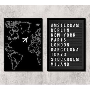 Kit 2 quadros viagem placa de aeroporto 45x34cm - com vidro Moldura: madeira preta Informações do produto tire todas as suas dúvidas no descritivo abaixo: decoração para quarto, sala, cozinha, escritório, área gourmet e muito mais. Chega de paredes vazias medidas - cada peça tem 45x34cm a3 . Material do papel - papel fotográfico brilhante de altíssima resolução acabamento - todos os quadros são acompanhados de vidro para proteção da imagem. - moldura em madeira maciça na cor preta e pendurador . - os quadros são embalados de forma segura com plástico bolha com camada dupla de acordo com o tamanho dos quadros. Garantia - garantia de 3 meses. Meu quadro chegou. Como posso fixá-lo Você precisa apenas de um martelo e um prego, pois os quadros já vão acompanhados de penduradores. Esta é a forma mais indicada. Como posso limpar meu quadro A limpeza é feita como um móvel comum da sua casa. Apenas um pano seco ou espanador são suficientes para tal