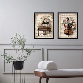 Kit 2 quadros vintage piano e violino - flores 24x18cm - com vidro Moldura: madeira branca Informações do produto tire todas as suas dúvidas no descritivo abaixo: decoração para quarto, sala, cozinha, escritório, área gourmet e muito mais. Chega de paredes vazias medidas - cada peça tem 24x18cm a5 . Material do papel - papel fotográfico brilhante de altíssima resolução acabamento - todos os quadros são acompanhados de vidro para proteção da imagem. - moldura em madeira maciça na cor preta ou branca conforme produto escolhido e pendurador . - os quadros são embalados de forma segura com plástico bolha com camada dupla de acordo com o tamanho dos quadros. Garantia - garantia de 3 meses. Meu quadro chegou. Como posso fixá-lo Você precisa apenas de um martelo e um prego, pois os quadros já vão acompanhados de penduradores. Esta é a forma mais indicada. Como posso limpar meu quadro A limpeza é feita como um móvel comum da sua casa. Apenas um pano seco ou espanador são suficientes para tal