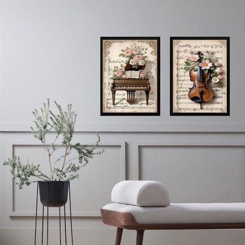 Kit 2 quadros vintage piano e violino - flores 45x34cm Moldura: madeira branca Informações do produto tire todas as suas dúvidas no descritivo abaixo: decoração para quarto, sala, cozinha, escritório, área gourmet e muito mais. Chega de paredes vazias. Medidas - cada peça tem 45x34cm a3 . Material do papel - papel fotográfico brilhante de altíssima resolução acabamento - todos os quadros são acompanhados de uma película de acetato para proteção da imagem. - os quadros são embalados de forma segura com plástico bolha com camada dupla de acordo com o tamanho dos quadros. Garantia - garantia de 3 meses. Meu quadro chegou. Como posso fixá-lo Você precisa apenas de um martelo e um prego, pois os quadros já vão acompanhados de penduradores. Esta é a forma mais indicada. Caso prefira, você pode utilizar uma fita dupla face neste caso, sugerimos de alta qualidade para evitar que descole e seu quadro caia . Como posso limpar meu quadro A limpeza é feita como um móvel comum da sua casa. Apenas um pano seco ou espanador são suficientes para tal