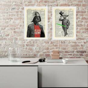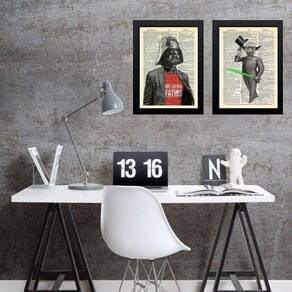 Kit 2 quadros vintage yoda e vader 45x34cm - com vidro Moldura: madeira preta Informações do produto tire todas as suas dúvidas no descritivo abaixo: decoração para quarto, sala, cozinha, escritório, área gourmet e muito mais. Chega de paredes vazias medidas - cada peça tem 45x34cm a3 . Material do papel - papel fotográfico brilhante de altíssima resolução acabamento - todos os quadros são acompanhados de vidro para proteção da imagem. - moldura em madeira maciça na cor preta ou branca conforme produto escolhido e pendurador . - os quadros são embalados de forma segura com plástico bolha com camada dupla de acordo com o tamanho dos quadros. Garantia - garantia de 3 meses. Meu quadro chegou. Como posso fixá-lo Você precisa apenas de um martelo e um prego, pois os quadros já vão acompanhados de penduradores. Esta é a forma mais indicada. Como posso limpar meu quadro A limpeza é feita como um móvel comum da sua casa. Apenas um pano seco ou espanador são suficientes para tal