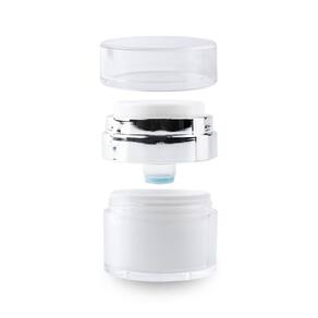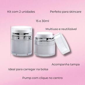 Contém: 01 - frasco recipiente para cremes e cosméticos pump 30 ml 01 - frasco recipiente para cremes e cosméticos pump 15 ml O kit de frascos recipientes para cremes e cosméticos com pump, são armazenadores compactos e elegantes, projetados para armazenar produtos de cuidados pessoais de forma prática e higiênica. Possui tampa que veda totalmente o produto, evitando vazamentos, sua primeira camada é composta por um pump no centro dele, assim quando aperta-lo, o produto sairá uniformemente no centro da embalagem. Útil, fácil de limpar após o fim do produto adicionado, podendo ser inúmeras vezes, por profissionais da área estética, como maquiadores, esteticistas, designers, utilizado para transportar seus cosméticos em viagens, e também para padronizar o armazenamento de refis, ou organizar sua penteadeira. Possui design minimalista em branco e prata. Os frascos são amplamente utilizados por sua praticidade e pelo fato de manter o produto fresco e protegido de contaminantes externos. Características principais: - kit 2 unidades; - ótimo custo benefício; - composto pelo frasco de 30ml e 15ml; - branco e prata; - pump no centro da embalagem; - acompanha tampa; - feito de material resistente; - reutilizável; - multiuso; - compacto; - mantém o produto protegido. Medidas: 30ml: 7,2 x 5,3 x 5,3 centímetros a x l x p . 15ml: 6 x 5,3 x 5,3 centímetros a x l x p . Volume: Capacidade de 30ml. Capacidade de 15ml. Boas compras ; Marca: Não Informado