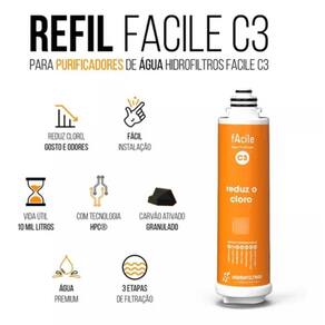 Kit 2 Refil C3 Filtro Purificador Facile Mangueira Cap Kit 2 Refil C3 Filtro Agua Para Purificador Facile E Mangueira Acessório Cap Facile Hidrofiltros Cuide da saúde de sua família economizando o seu bolso -A água com cloro não é indicada para consumo humano. Portanto, é essencial o uso de um filtro para redução de cloro decloração antes de beber água da rede de abastecimento. -O Refil Facile C3 possui elemento filtrante capaz de adsorver o cloro livre e reduzir outros componentes orgânicos que causam gosto e odor desagradável na água. Benefícios: -água 100% Cristalina -água sem gosto de canos, limo e sujeiras -saúde livre de bactérias -fácil de trocar Não precisa de técnico -durabilidade -versátil Utilizado com Adaptador Cap e Purificador - de Água Rica em Alcalinidade -eleva o PH da água -água sem sujeira Sedimentos, barro, Limo, Areia e Insetos -possui a maior vida útil do mercado: até 10 mil litros ou 1 ano para a troca do refil Como funciona a filtragem O Refil Hidrofiltros foi desenvolvido por uma tecnologia capaz de absorver o cloro livre e ainda reduz outros componentes orgânicos como trialometanos THM , , solventes industriais e literalmente milhares de contaminantes garantindo uma água livre de gostos e odores. Características Técnicas: -temperatura de operação: 5C mín. / 50C -máx.Pressão de operação: 19,6 kPa mín. A 399 kPa máx 2 mca / 40 mca . -composição: polipropileno, carvão e minerais -grau de Filtração: Classe C =5 a 15 micra -vazão máxima: 40 l/h -peso bruto: 0,485 kg -peso líquido: 0,445 kg -dimensionais: 199 mm x 65 mm -com redução do cloro livre de no mínimo 75% -retenção de partículas -ponto de Uso -retenção de Partículas: Classe D Onde usar Observação importante: Excelente para apartamentos, para casas recomendamos mínimo de 3mca para uma boa vazão. Ele pode ser Utilizado diretamente no Purificador Facile, ou antes da torneira com a conexão CAP Facile roscada diretamente na mangueira da torneira Rosca Normas e Referências: Este aparelho destina-se ao uso em água que atende a portaria PRC MS 5:2017 do Ministério da Saúde. Atende as especificações da norma NBR 16098:2012. Quando efetuar a troca OBS.: Aconselhamos a troca do refil de reposição a cada 10.000 litros ou quando for observada redução do fluxo de água, ou a cada 1 ano. Avisos importantes: 1- Antes de comprar pergunte a vontade, verifique se o ponto de uso da sua instalação tem pressão suficiente para ter uma excelente vazão de água recomendamos 3mca ou mais . 2- Produto ideal para pontos de uso após a Caixa d'agua, não recomendamos pontos de uso com água direto da rua sem um pré-filtro. Itens Inclusos: 2x Refil C3 Facile Hidrofiltros Marca: Refil Para Conexão Mangueira Ean: 7734257901843