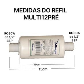 Kit 2 Refil Pré Filtro Água Universal Rosca de 1/2 Adaptação Fácil Kit 2 unidades - Pré Filtro 24H-MULTI12 - Filtro de Água Universal - Ideal para ser como Pré Filtro de outros purificadores de água, maximizando a eficiência da filtragem e a durabilidade do filtro. - Filtro Universal com Roscas de 1/2 na entrada e saída. - Pequeno: Cabe em qualquer lugar, de baixo da pia, etc. - Fácil adaptação em qualquer ponto de água, por ter rosca de 1/2 universal. - Longa duração: Vida útil estimada de 6 meses ou aproximadamente 3.000 litros a depender a qualidade da água . - O filtro elimina Partículas Sólidas e ajuda a Elevar o pH. Este filtro não reduz o cloro da água. Seu foco é reter partículas sólidas, como areia, barro, entre várias outras partículas. As marcas e produtos citados e ilustrados são propriedades de seus respectivos fabricantes e aparecem apenas para demonstrar a compatibilidade deste produto. --------------------------------------------------------------------------- Marca: 24 Horas Filtros Eficiência da retenção de partículas: Classe III Eficácia Anti-Microbiana 96%: Aprovado Produto de acordo com a norma ABNT NBT 16098:2012. Elemento filtrando destinado ao uso em água que atenda a portaria N 2.914 do Ministério da Saúde. Marca: Não Informado