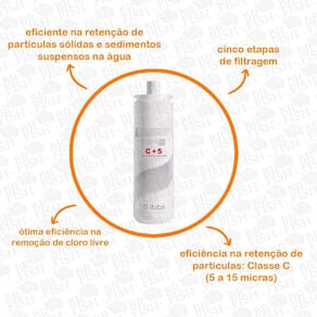 Refil para purificador de água IBBL C+5. Elimina impurezas sólidas (barro, ferrugem, fungos, algas), odores e sabores indesejáveis. Retenção de partículas classe C. Redução de cloro livre aprovada. Vida útil de 6 meses ou 6000 litros.Tipo