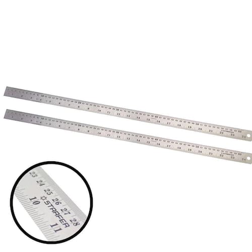 A Régua Aço é ideal para determinar medidas em desenhos ou superfícies, medição em escala de milímetros e polegadas, utilizada em vários segmentos, como: costura e patch work, desenhos, marcenaria, construção civil, indústrias, entre outros. Produzida em aço inox, oferece alta resistência, possui tabela de conversão de unidades no verso e excelente para trabalhos de corte com estilete.CARACTERÍSTICAS TÉCNICAS:Material: Aço inoxMedidas: 60cm - 24 comprimento x 25mm largura x 0,8mm espessura Graduação: Milímetros e polegadasGrau de circunferência: 90Tipo de régua geométrica: ProjetistaQuantidade: 2 unidadesMarca: StarferRef.: 11995608