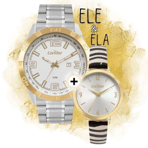 Kit Relógio Condor Ele e Ela O Kit Relógio Condor Ele e Ela - uma combinação perfeita de estilo, elegância e funcionalidade para casais modernos. Com designs exclusivos e sofisticados, esses relógios são verdadeiras obras de arte para casais cheios de estilo. O relógio feminino é delicado e refinado, enquanto o masculino é robusto e marcante. Fabricados com materiais de alta qualidade, garantem durabilidade e longevidade. Celebre seu relacionamento único com esses relógios especiais. O presente perfeito para casais que valorizam estilo, qualidade e união. Adquira já o seu kit e deixe sua história de amor brilhar com os relógios CondorRelógio Condor Masculino Analógico Civic Misto COPC32CL/4KMarca: CondorModelo: COPC32CL/4KTipo de mostrador: AnalógicoMecanismo: QuartzoAlimentação: BateriaFormato da Caixa: RedondoCor do mostrador: Prata com Ponteiro e Index DouradoCor da caixa: Pratacor da pulseira: PrataMaterial do Vidro: Cristal MineralMaterial da caixa: MetalMaterial da pulseira: Aço InoxTipo de Fecho: Dobrável com 2 botõesNível de Resistência à Água: 50mCalendário: SimCronômetro: NãoAlarme: NãoLuz noturna: Ponteiros e Index FosforescenteRelógio Condor Feminino Analogico Prata COPC21JKC/4KMarca: CondorTipo de mostrador: AnalógicoMecanismo: QuartzoAlimentação: BateriaFormato da Caixa: RedondoCor do mostrador: PrataCor da caixa: Pratacor da pulseira: PrataMaterial do Vidro: Cristal MineralMaterial da caixa: Aço InóxMaterial da pulseira: Aço InoxTipo de Fecho: Dobrável com 2 botõesNível de Resistência à Água: 50 MetrosCalendário: NãoCronômetro: NãoAlarme: NãoLuz noturna: NãoKit Relógio Condor Feminino Analogico Dourado COPC21JGY/K3DMarca: CondorTipo de mostrador: AnalógicoMecanismo: QuartzoAlimentação: BateriaFormato da Caixa: RedondoCor do mostrador: Prata com Ponteiro e Index DouradoCor da caixa: DouradoCor da pulseira: Animal PrintMaterial do Vidro: Cristal MineralMaterial da caixa: MetalMaterial da pulseira: SintéticoTipo de Fecho: FivelaNível de Resistência à Água: 30mCalendário: NãoCronômetro: NãoAlarme: NãoLuz noturna: NãoConteúdo da Embalagem:Estojo da MarcaAcessórios (correspondentes a cada modelo)Manual em PortuguêsCertificado de 01 ano junto ao FabricanteNota Fiscal EletrônicaO Grupo Technos assegura o perfeito funcionamento do seu relógio pelo período de 01 ano em todo território nacional, caso o seu produto apresente algum defeito, encaminhe diretamente à assistência técnica mais próxima de sua região, sempre acompanhado da documentação recebida.