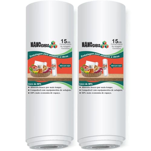 Kit 2 Rolos Nanocubos 15x500 Sacos Ranhura Seladora A Vácuo Embalagens 2 rolos NANOCUBOS 15 cm X 500 cm para seladoras a vácuo. Embalar produtos a vácuo é a melhor forma de mantê-los sempre protegidos por muito mais tempo. Ao embalar alimentos, a validade deles é completamente estendida, pois eles não terão nenhum contato com o ar e serão pouco afetados pela ação do tempo. Você pode embalar tanto alimentos crus como alimentos já preparados para serem consumidos em outro momento. Você economiza muito dinheiro e evita o desperdício Os sacos para vácuo Nanocubos são produzidos com alta tecnologia em Nylon Poli seguindo padrões de qualidade internacional. Possuem 12 micras, 3 barreiras de proteção, sem presença de BPA Não tóxicos e funcionam com equipamentos de embalagens a vácuo. Além de alimentos, é possível utilizá-lo com objetos pessoais, documentos ou utensílios, conservando-os como novos por muito tempo e aumentando sua vida útil.
