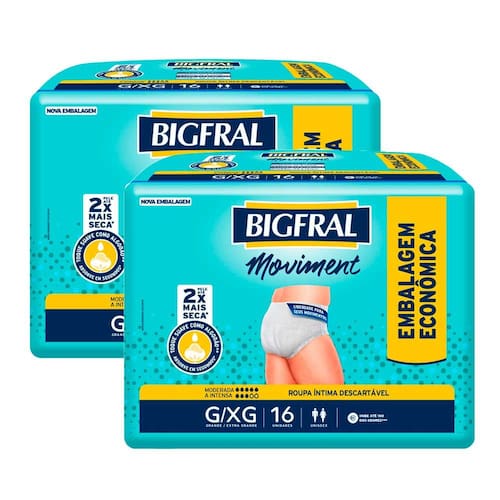 CINTURA ELÁSTICA MODELADORA Cintura elástica que contribui para a melhor adaptação da roupa íntima ao corpo, proporcionando total discrição e conforto.   ABSORVE EM SEGUNDOS* Com camada protetora que mantém a pele seca através de uma rápida distribuição de urina, menor retorno e máxima absorção.   BARREIRA PROTETORA ANTIVAZAMENTO Proporciona proteção extra contra vazamentos, permitindo que você se movimente naturalmente no seu dia a dia.   SISTEMA ANTIODOR Sistema que neutraliza o odor da urina, contribuindo para seu bem-estar.   Bigfral Moviment Feminina é a calcinha descartável ideal para incontinência moderada a intensa. Foi desenvolvida especialmente para mulheres, pois além de ser discreta, tem toque suave como algodão proporcionando maior conforto. Absorve em segundos mantendo a umidade longe da pele e deixando-a até 2x mais seca. As barreiras antivazamento e o controle de até 100% dos odores proporcionam segurança para que você desfrute seu dia e se movimente com confiança.