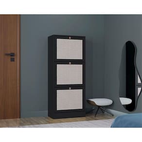 Kit 2 Sapateiras Tropical 3 Portas Multiuso Vertical Poquema Carvalho/preto Procurando uma solucao inteligente e elegante para a bagunca de sapatos? Conheca o Kit com 2 Sapateiras Tropical 3 Portas Multiuso Vertical. Este kit foi pensado para quem deseja otimizar o espaco sem abrir mao de um design diferenciado, transformando seu quarto, closet ou lavanderia em um ambiente mais organizado e cheio de personalidade. Chega de calcados espalhados! Com a estrutura vertical, voce ganha espaco e praticidade, mantendo tudo arrumado e de facil acesso.