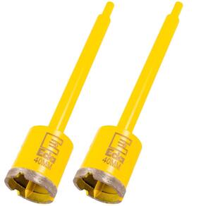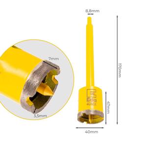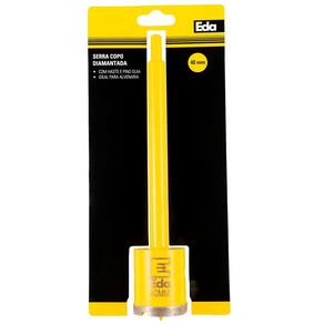 Kit 2 Serra Copo Diamantada 40mm com Haste Pino Guia Eda Serra copo diamantada com haste e pino guia, indicada para cortar telhas, tijolos, cerâmicas, azulejos, concreto, parede, pedras, refratários, granitos entre outros. - Marca: Eda - Jogo exclusivo com 2 serras copo - Diâmetro: 40mm - Serra Copo com haste e pino guia - Ideal para alvenaria - Comprimento da haste: 170mm - Diâmetro do encaixe da haste no mandril: 8,8mm - Altura externa do copo: 47mm - Altura da borda diamantada: 7mm - Espessura do copo: 3,5 mm - Facilita a realização de furos de grandes diâmetros em tempo reduzido - Indicada para cortar telhas, tijolos, cerâmicas, azulejos, concreto, parede, pedras, refratários, granitos entre outros. - Quando utilizada com o pino guia, deve-se fazer um furo com broca de vídea antes. - Nunca utilizar o equipamento na função IMPACTO/MARTELETE - Haste e corpo em aço carbono - Camada de corte: Pasta abrasiva com diamante - Utilize com refrigeração - Peso bruto: 370 gramas - : 90 dias Marca: Não Informado