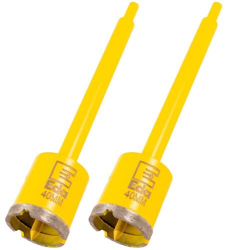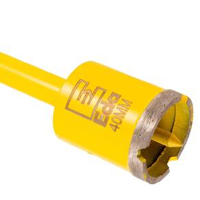 Kit 2 Serra Copo Diamantada 40mm com Haste Pino Guia Eda Serra copo diamantada com haste e pino guia, indicada para cortar telhas, tijolos, cerâmicas, azulejos, concreto, parede, pedras, refratários, granitos entre outros. - Marca: Eda - Jogo exclusivo com 2 serras copo - Diâmetro: 40mm - Serra Copo com haste e pino guia - Ideal para alvenaria - Comprimento da haste: 170mm - Diâmetro do encaixe da haste no mandril: 8,8mm - Altura externa do copo: 47mm - Altura da borda diamantada: 7mm - Espessura do copo: 3,5 mm - Facilita a realização de furos de grandes diâmetros em tempo reduzido - Indicada para cortar telhas, tijolos, cerâmicas, azulejos, concreto, parede, pedras, refratários, granitos entre outros. - Quando utilizada com o pino guia, deve-se fazer um furo com broca de vídea antes. - Nunca utilizar o equipamento na função IMPACTO/MARTELETE - Haste e corpo em aço carbono - Camada de corte: Pasta abrasiva com diamante - Utilize com refrigeração - Peso bruto: 370 gramas - : 90 dias Marca: Não Informado