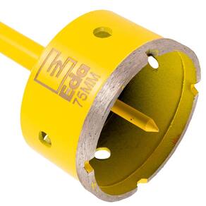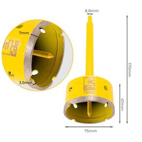 Kit com 2 Serra Copo Diamantada 75mm com Haste Pino Guia Eda Serra copo diamantada com haste e pino guia, indicada para cortar telhas, tijolos, cerâmicas, azulejos, concreto, parede, pedras, refratários, granitos entre outros. - Marca: Eda - Jogo exclusivo com 2 serras copo - Diâmetro: 75mm - Serra Copo com haste e pino guia - Ideal para alvenaria - Comprimento da haste: 170mm - Diâmetro do encaixe da haste no mandril: 8,8mm - Altura externa do copo: 47mm - Altura da borda diamantada: 7mm - Espessura do copo: 3,5 mm - Facilita a realização de furos de grandes diâmetros em tempo reduzido - Indicada para cortar telhas, tijolos, cerâmicas, azulejos, concreto, parede, pedras, refratários, granitos entre outros. - Quando utilizada com o pino guia, deve-se fazer um furo com broca de vídea antes. - Nunca utilizar o equipamento na função IMPACTO/MARTELETE - Haste e corpo em aço carbono - Camada de corte: Pasta abrasiva com diamante - Utilize com refrigeração - Peso bruto: 500 gramas - : 90 dias Marca: Não Informado