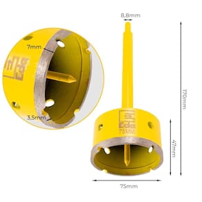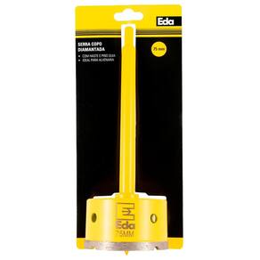 Kit com 2 Serra Copo Diamantada 75mm com Haste Pino Guia Eda Serra copo diamantada com haste e pino guia, indicada para cortar telhas, tijolos, cerâmicas, azulejos, concreto, parede, pedras, refratários, granitos entre outros. - Marca: Eda - Jogo exclusivo com 2 serras copo - Diâmetro: 75mm - Serra Copo com haste e pino guia - Ideal para alvenaria - Comprimento da haste: 170mm - Diâmetro do encaixe da haste no mandril: 8,8mm - Altura externa do copo: 47mm - Altura da borda diamantada: 7mm - Espessura do copo: 3,5 mm - Facilita a realização de furos de grandes diâmetros em tempo reduzido - Indicada para cortar telhas, tijolos, cerâmicas, azulejos, concreto, parede, pedras, refratários, granitos entre outros. - Quando utilizada com o pino guia, deve-se fazer um furo com broca de vídea antes. - Nunca utilizar o equipamento na função IMPACTO/MARTELETE - Haste e corpo em aço carbono - Camada de corte: Pasta abrasiva com diamante - Utilize com refrigeração - Peso bruto: 500 gramas - : 90 dias Marca: Não Informado Ean: 7734625975315
