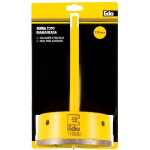Kit 2 Serras Copo Diamantada 110mm com Haste Pino Guia Eda Profissional Serra copo diamantada com haste e pino guia, indicada para cortar telhas, tijolos, cerâmicas, azulejos, concreto, parede, pedras, refratários, granitos entre outros. - Marca: Eda Profissional - Jogo com 2 serras copo - Diâmetro: 110mm - Serra Copo com haste e pino guia - Ideal para alvenaria - Comprimento da haste: 170mm - Diâmetro do encaixe da haste no mandril: 8,8mm - Altura externa do copo: 47mm - Altura da borda diamantada: 7mm - Espessura do copo: 3,5 mm - Facilita a realização de furos de grandes diâmetros em tempo reduzido - Indicada para cortar telhas, tijolos, cerâmicas, azulejos, concreto, parede, pedras, refratários, granitos entre outros. - Quando utilizada com o pino guia, deve-se fazer um furo com broca de vídea antes. - Nunca utilizar o equipamento na função IMPACTO/MARTELETE - Haste e corpo em aço carbono - Camada de corte: Pasta abrasiva com diamante - Utilize com refrigeração - Peso bruto: 830 gramas - Garantia: 90 dias