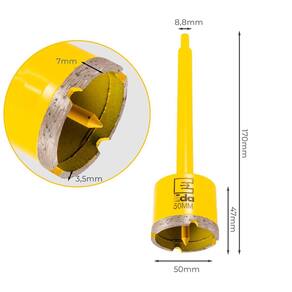 Kit 2 Serras Copo Diamantada 50mm com Haste Pino Guia Eda Serra copo diamantada com haste e pino guia, indicada para cortar telhas, tijolos, cerâmicas, azulejos, concreto, parede, pedras, refratários, granitos entre outros. - Marca: Eda - Jogo exclusivo com 2 serras copo 50mm - Diâmetro: 50mm - Serra Copo com haste e pino guia - Ideal para alvenaria - Comprimento da haste: 170mm - Diâmetro do encaixe da haste no mandril: 8,8mm - Altura externa do copo: 47mm - Altura da borda diamantada: 7mm - Espessura do copo: 3,5 mm - Facilita a realização de furos de grandes diâmetros em tempo reduzido - Indicada para cortar telhas, tijolos, cerâmicas, azulejos, concreto, parede, pedras, refratários, granitos entre outros. - Quando utilizada com o pino guia, deve-se fazer um furo com broca de vídea antes. - Nunca utilizar o equipamento na função IMPACTO/MARTELETE - Haste e corpo em aço carbono - Camada de corte: Pasta abrasiva com diamante - Utilize com refrigeração - Peso bruto: 380 gramas - : 90 dias Marca: Não Informado