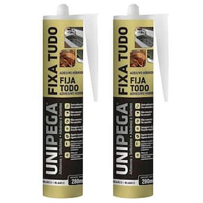 Ficha Técnica:Marca: Unipega Modelo: Branco Fixa Tudo Tipo: Adesivo Híbrido Monocomponente Cor: Branco Capacidade: 280ml cada unidade Indicado para: Metais, concreto, pedras, cerâmicas, vidro, policarbonato e PVC