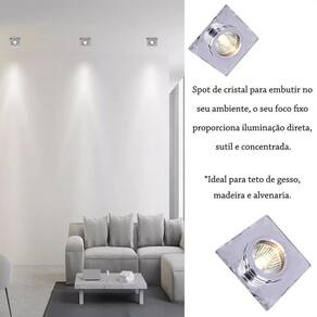 Spot de cristal com o foco fixo, perfeito para embutir no teto ou forro de gesso, madeira ou pvc, proporcionando um ambiente mais clear. Acompanha soquete GU10 e é compatível com lâmpadas MR16, LED e dicróica.
