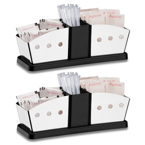Kit 2 suporte porta sachês inox café, adoçante e açúcar restaurante ========== sobre o produto ========== Organize seu cantinho do café com muito mais praticidade e sofisticação o suporte porta sachês inox é perfeito para bares, cafeterias, escritórios e uso doméstico. Com divisórias específicas, acomoda sachês de açúcar, adoçante e mexedores de forma elegante e funcional. ========== especificações ========== Unidades: 2 Material: aço inox e polipropileno Divisórias: 3 compartimentos 2 laterais para sachês e 1 central para palitos/mexedores Comprimento: 19,5cm Largura: 6,5cm Altura: 7cm P: ele enferruja R: não, o aço inox é resistente à corrosão e indicado para uso intenso. P: vai desmontado R: não, já vai montado e pronto para uso. P: cabe sachês grandes R: sim, acomoda sachês padrão de 5g a 7g com folga. P: o produto é novo ou
