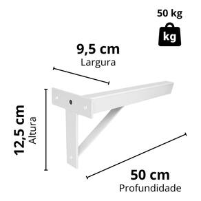 Fabricados em tubo metalon 50x20mm com espessura de 0,90mm, suportam até 50Kg por peça. A versão galvanizada é indicada para locais úmidos com maior exposição, enquanto a versão branca traz visual limpo e moderno com pintura eletrostática.