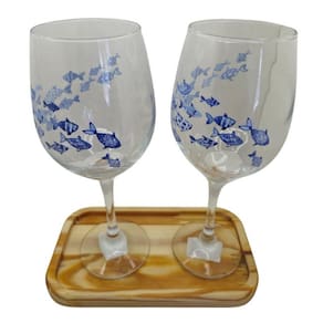 Kit 2 Taças Bandeja Peixes Cristal Personalizada Vinho 490Ml