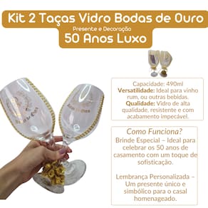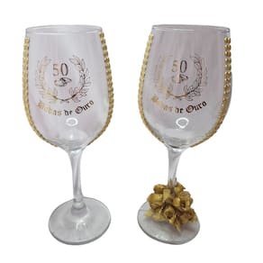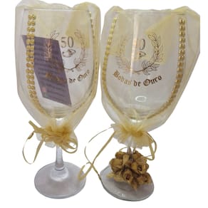 Adquira esta Taça maravilhosa e ganhe um lindo presente. Kit 2 Taças Vidro Bodas de Ouro 50 Anos Rosas Luxo Personalizada Vinho 490ml - Nadir Figueiredo - Barone