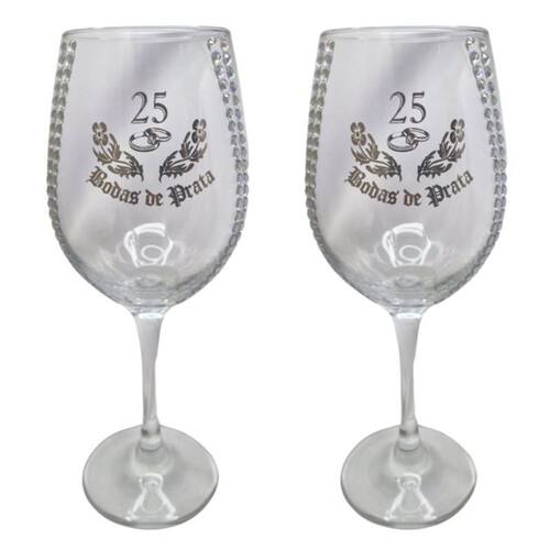 Kit 2 Taças Vidro Bodas de Prata 25 Anos Luxo Kit 2 Taças Bodas de Prata 25 anos Casal Cristal Personalizada Vinho 490ml - Nadir Figueiredo - Barone