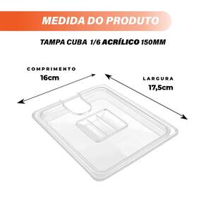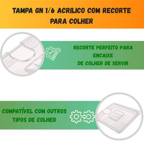 Material: Acrílico de alta resistência (Policarbonato) Dimensões: 17,5 cm x 16 cm (L x C) Compatibilidade: Compatível com Cuba Gastronômica GN 1/6 Diferencial: Recorte para encaixe de colher de acrílico Cor: Transparente Uso indicado: Restaurantes, buffets, sorveterias, açaíterias, cozinhas industriais e eventos